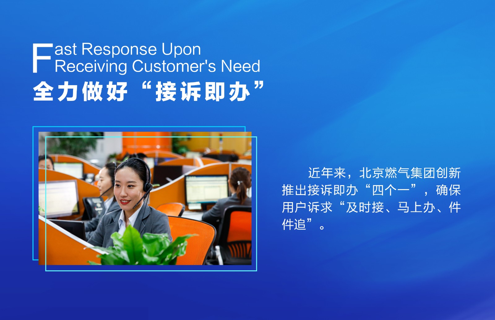 為及時(shí)回應(yīng)解決用戶訴求全面提升話務(wù)質(zhì)量,北京燃?xì)饧瘓F(tuán)在現(xiàn)有集團(tuán)熱線職場(chǎng)基礎(chǔ)上啟用了96777通州熱線分中心,進(jìn)一步提升用戶訴求響應(yīng)速度,保障用戶安全安心用氣。